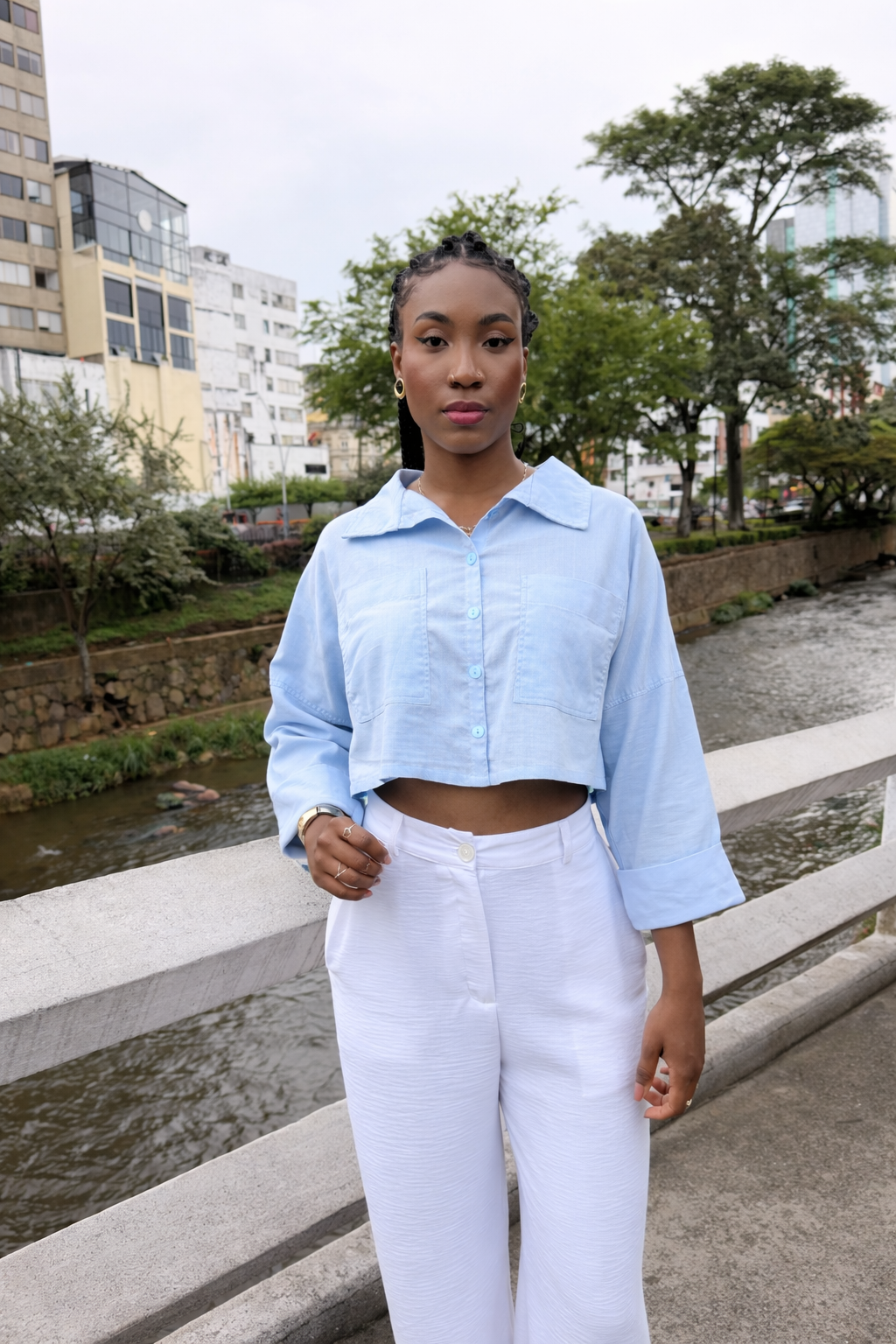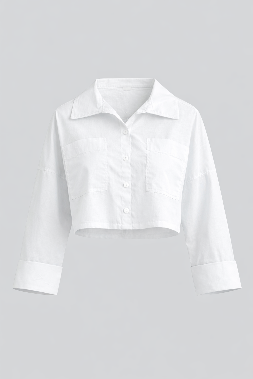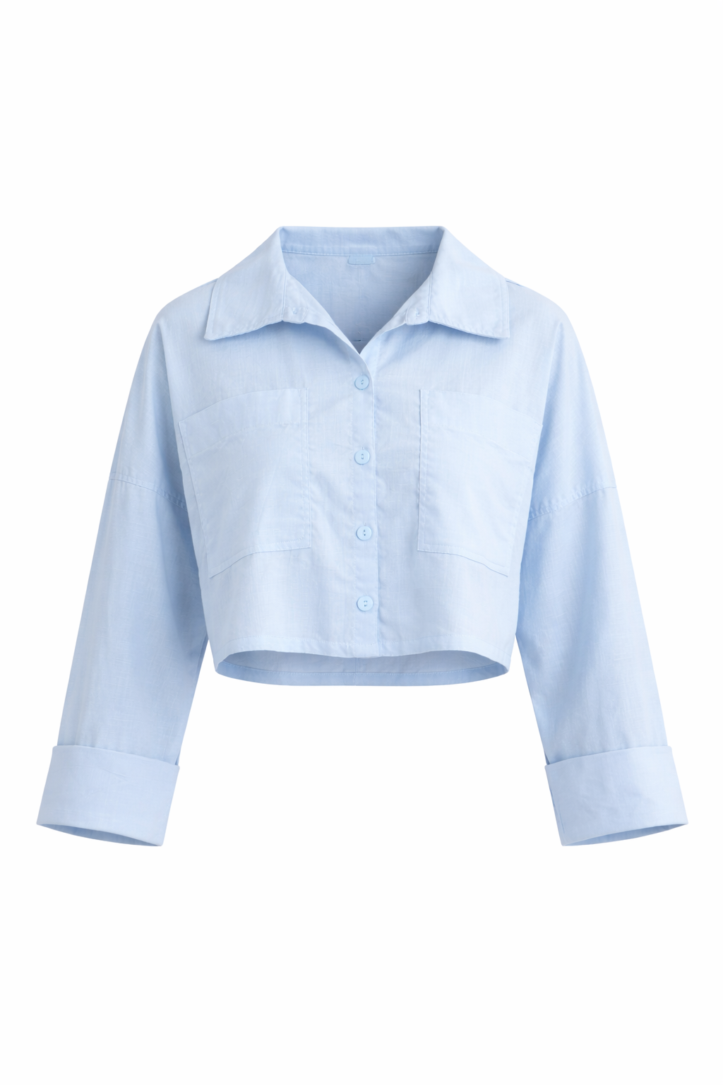 Camisera corta con cuello, bolsillos delanteros, manga 3/4 con puño que simula doblez. Color blanco, elaborada en popelina, y azul, en lino.