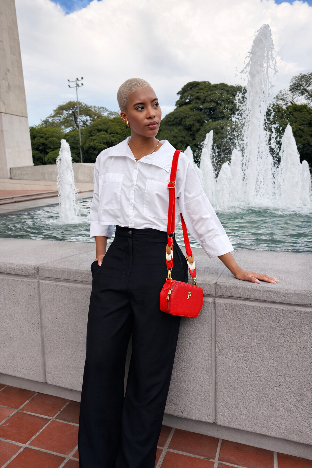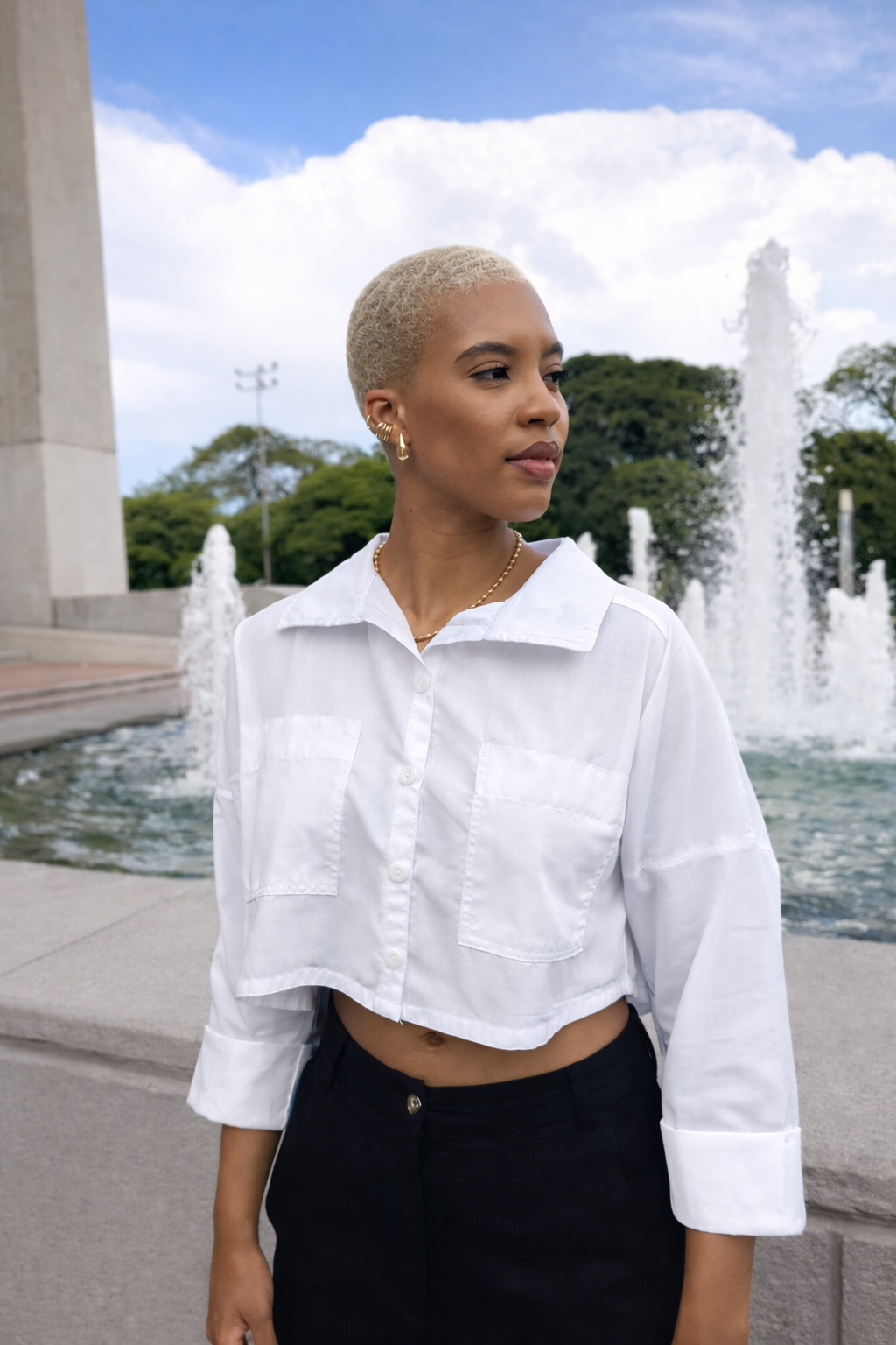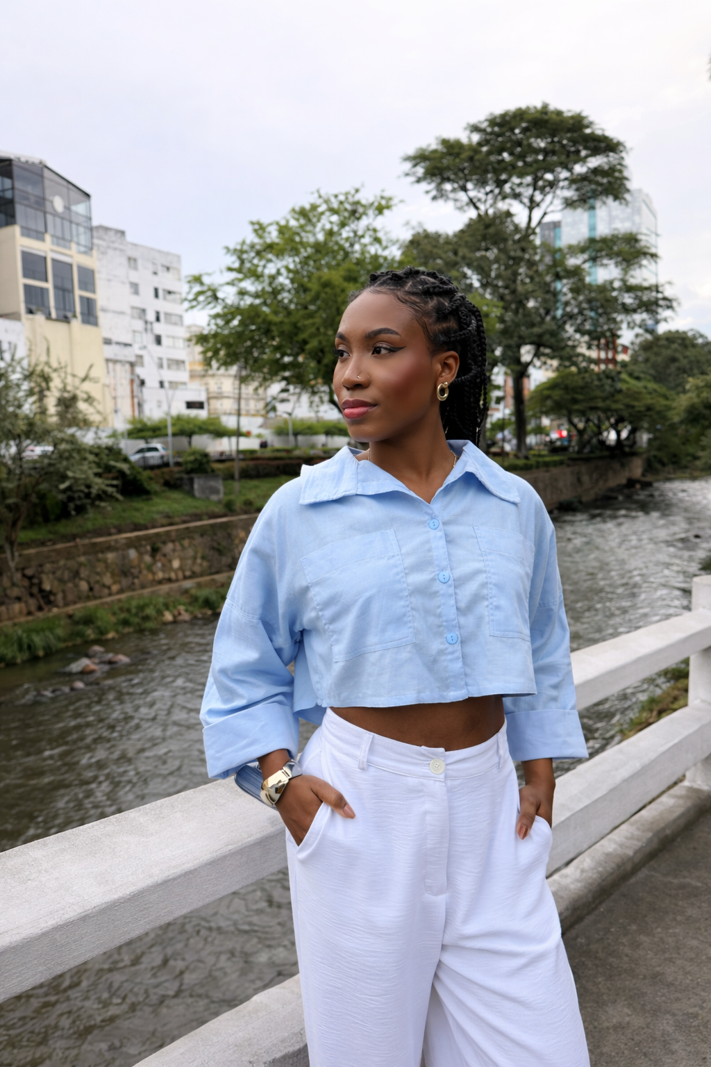 Camisera corta con cuello, bolsillos delanteros, manga 3/4 con puño que simula doblez. Color blanco, elaborada en popelina, y azul, en lino.